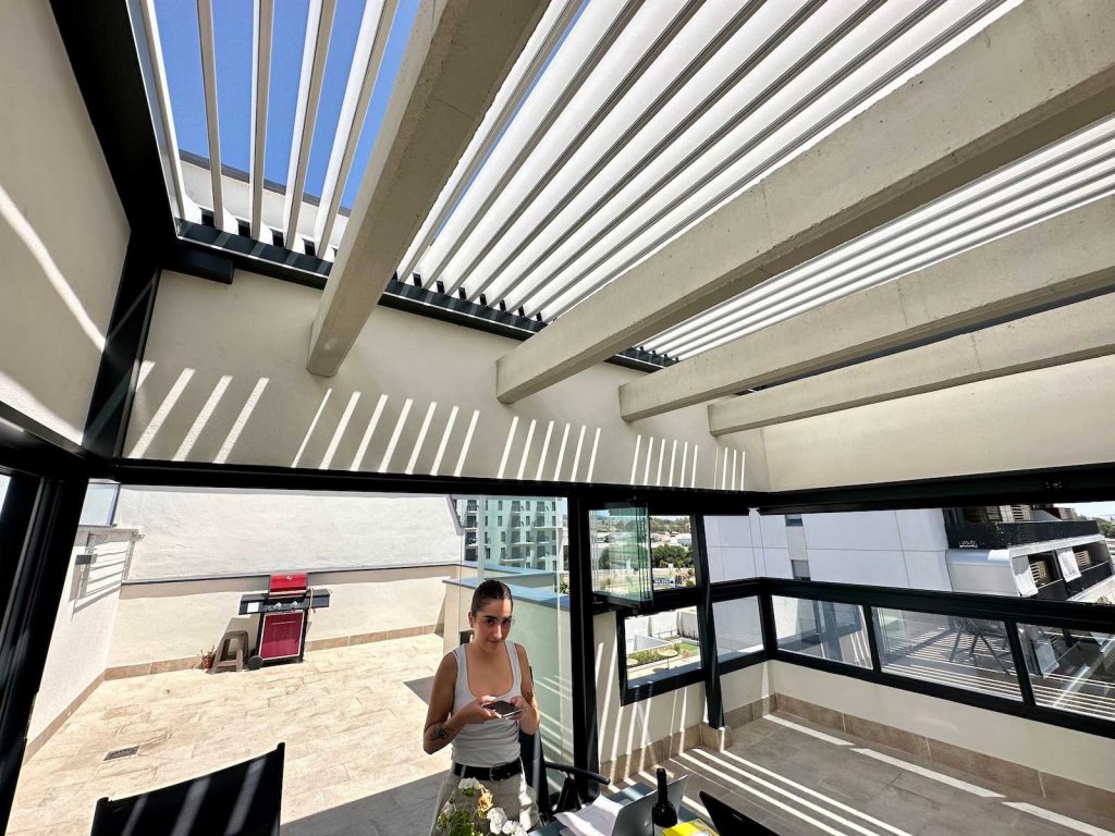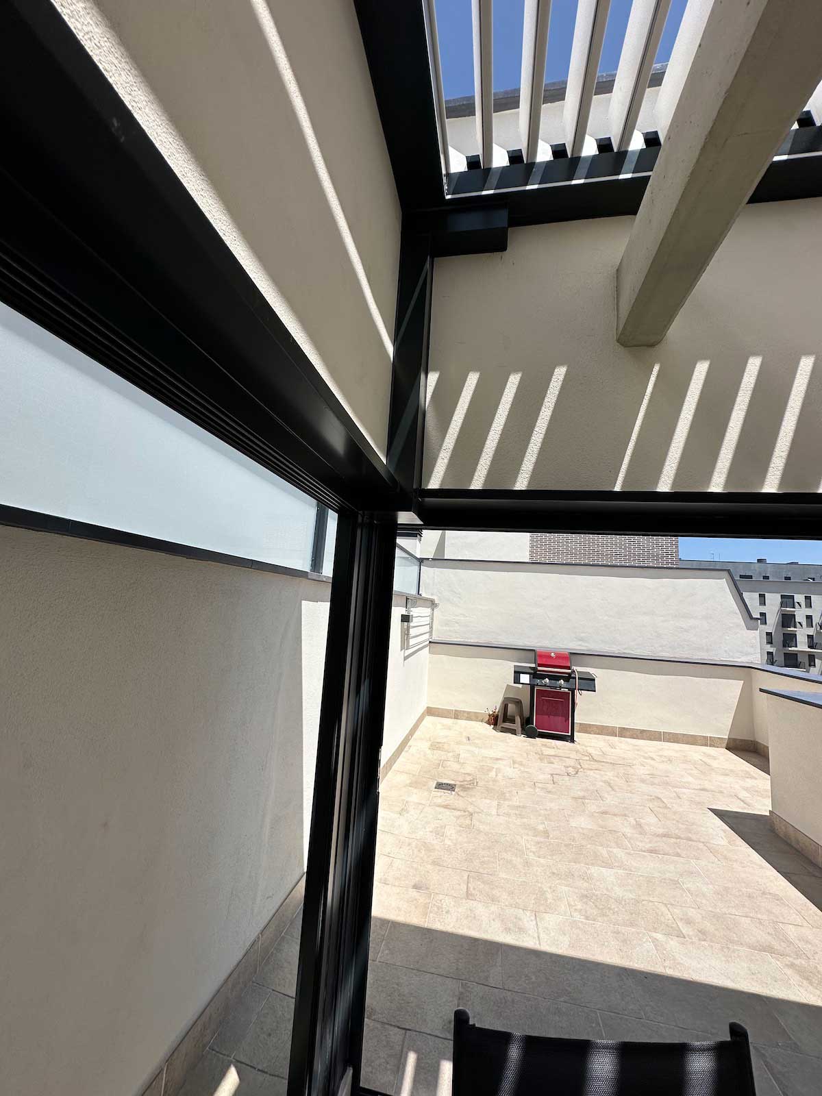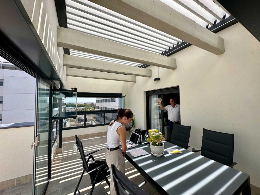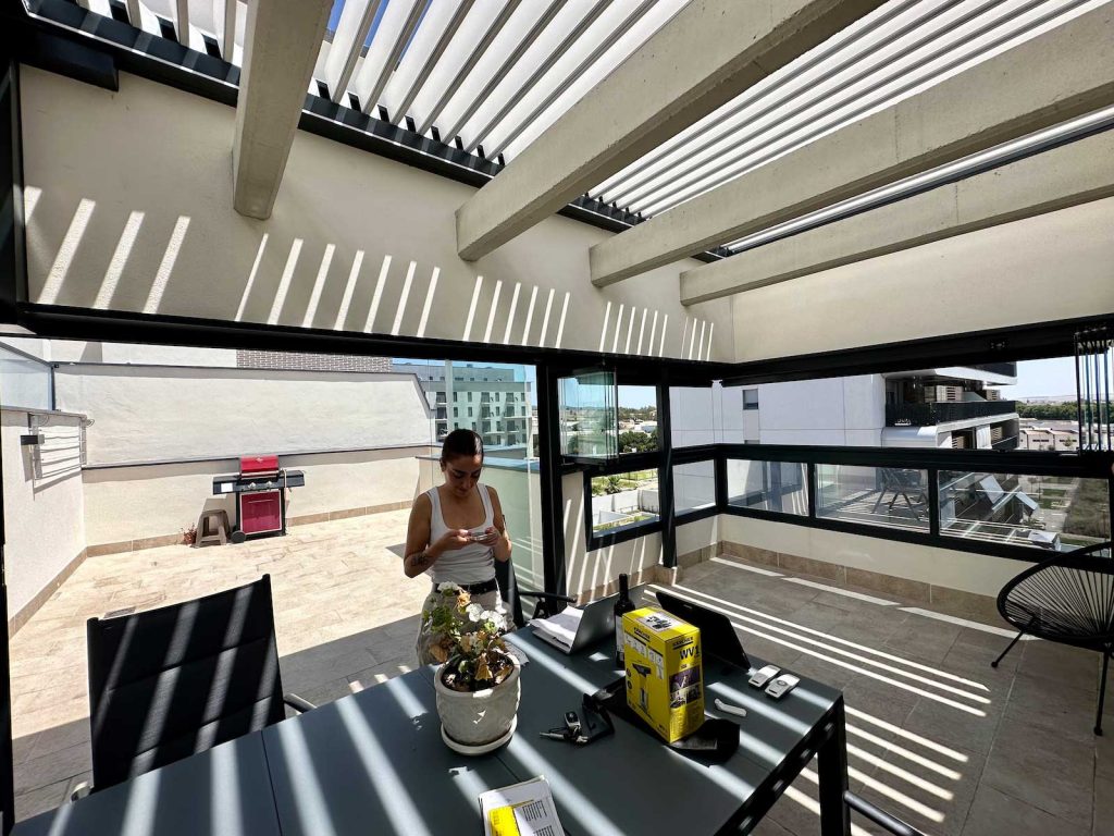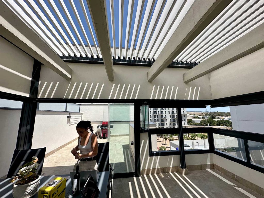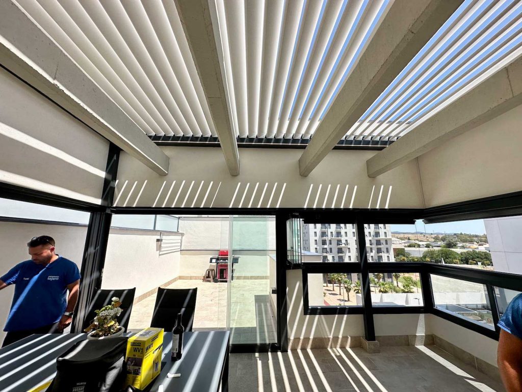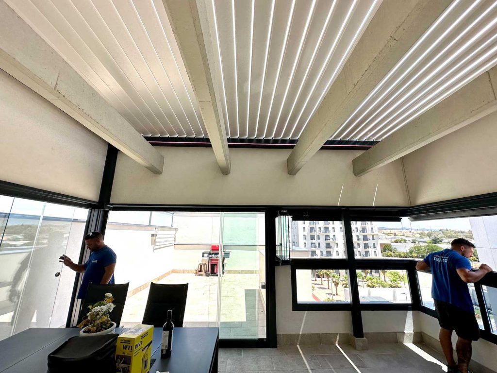 Instalación realizada en Córdoba capital compuesta de pérgola Bioclimática de lamas orientables con iluminación LED perimetral, incluyendo sensor de lluvia. Sistemas verticales en cortinas de cristal correderas y abatibles + 2 Screen verticales motorizados para generar esta magnífica zoom de estar.