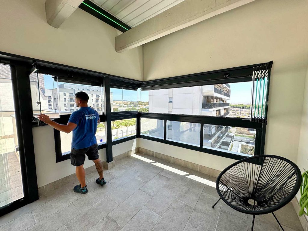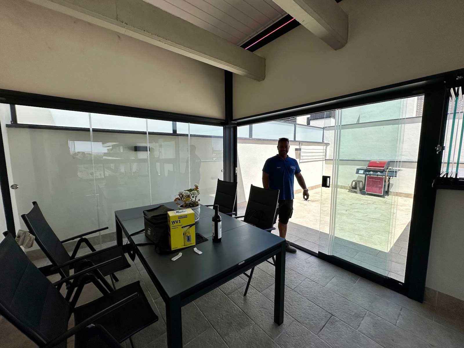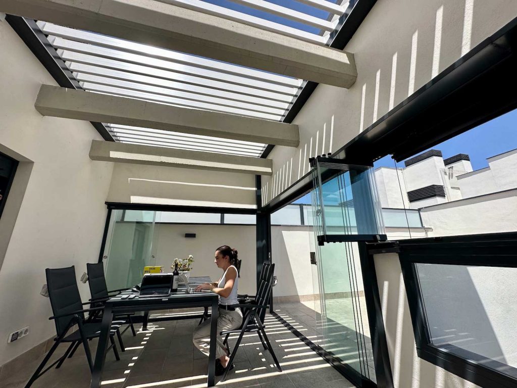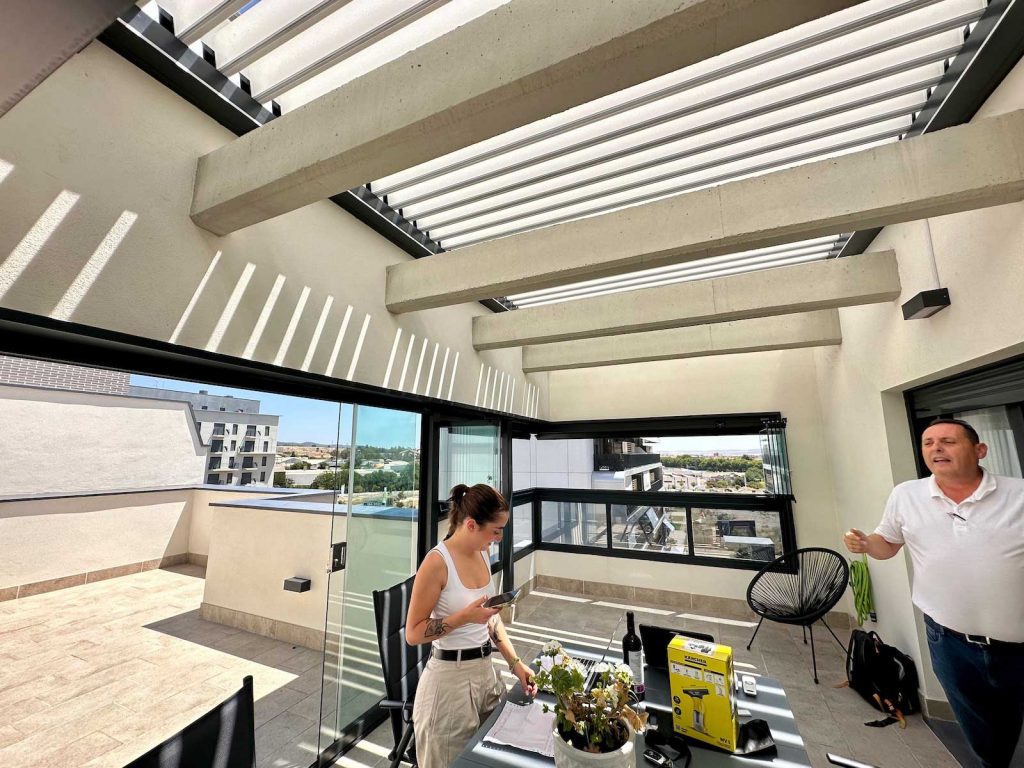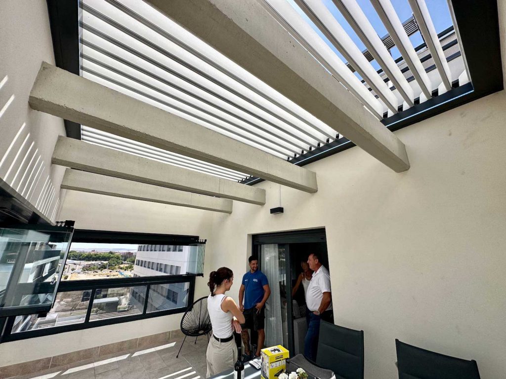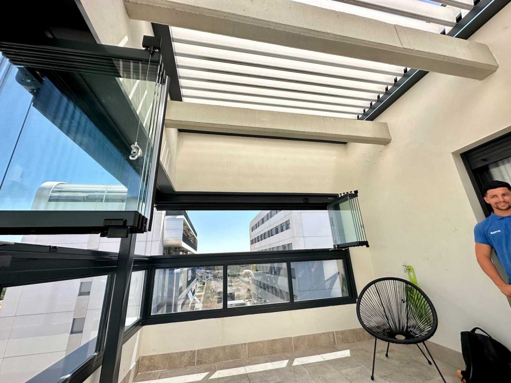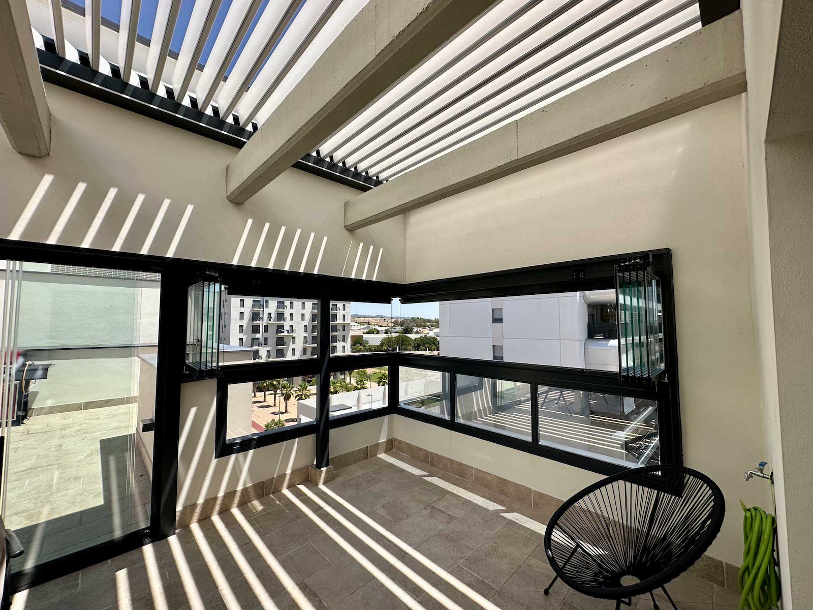 Instalación realizada en Córdoba capital compuesta de pérgola Bioclimática de lamas orientables con iluminación LED perimetral, incluyendo sensor de lluvia. Sistemas verticales en cortinas de cristal correderas y abatibles + 2 Screen verticales motorizados para generar esta magnífica zoom de estar.