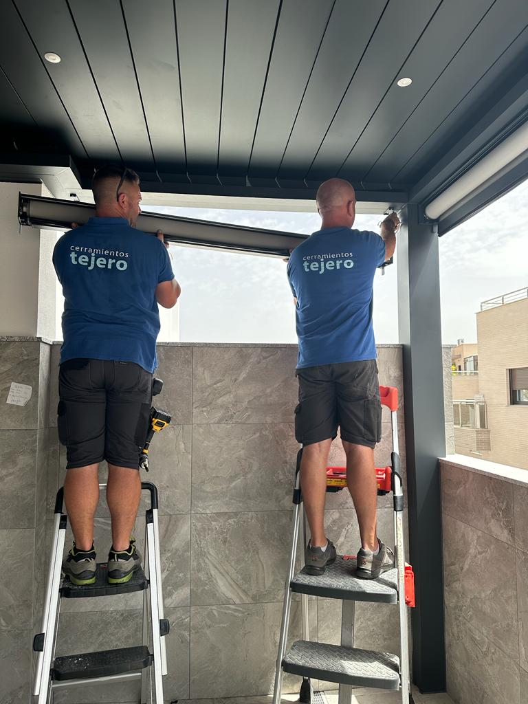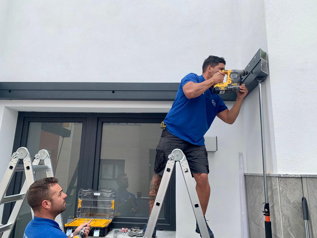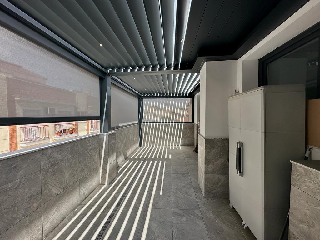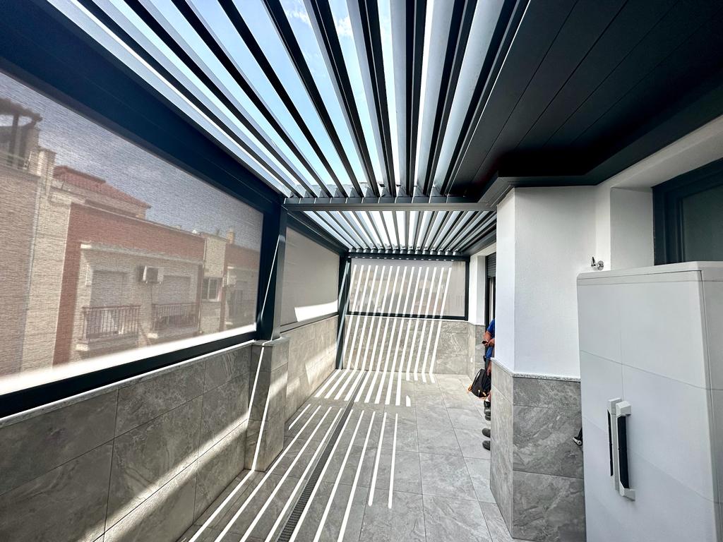 Proyecto realizado en Granada, compuesto de dos pérgolas bioclimáticas con descuadre + iluminación LED perimetral + focos LED integrados en las lamas y Screen verticales motorizados para una perfecta protección solar.