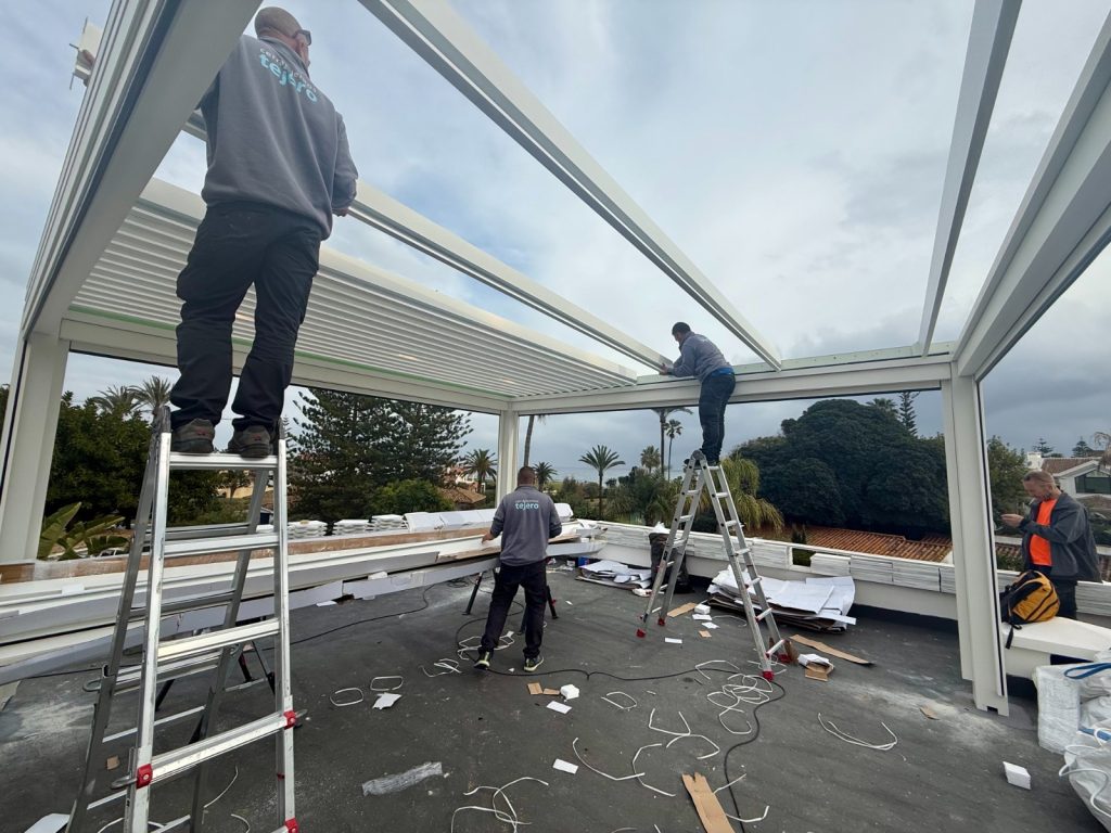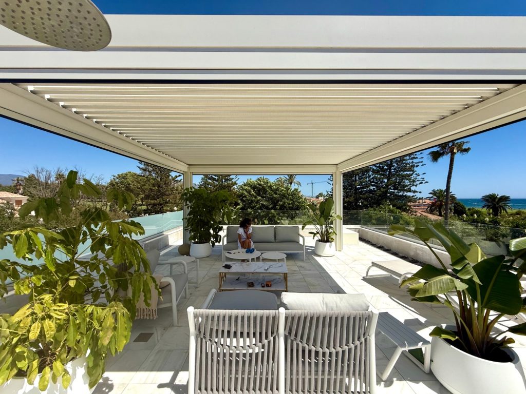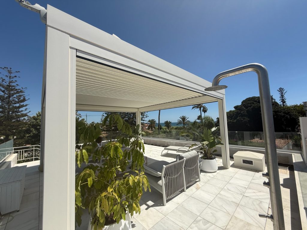 Os traemos este proyecto realizado en Guadalmina Baja, entre Marbella y Estepona. Un proyecto un poco diferente ¿Por qué?. Porque en esta ocasión hemos realizado la instalación de la pérgola bioclimática en la terraza, pero en forma de isla, con las 4 caras visibles.