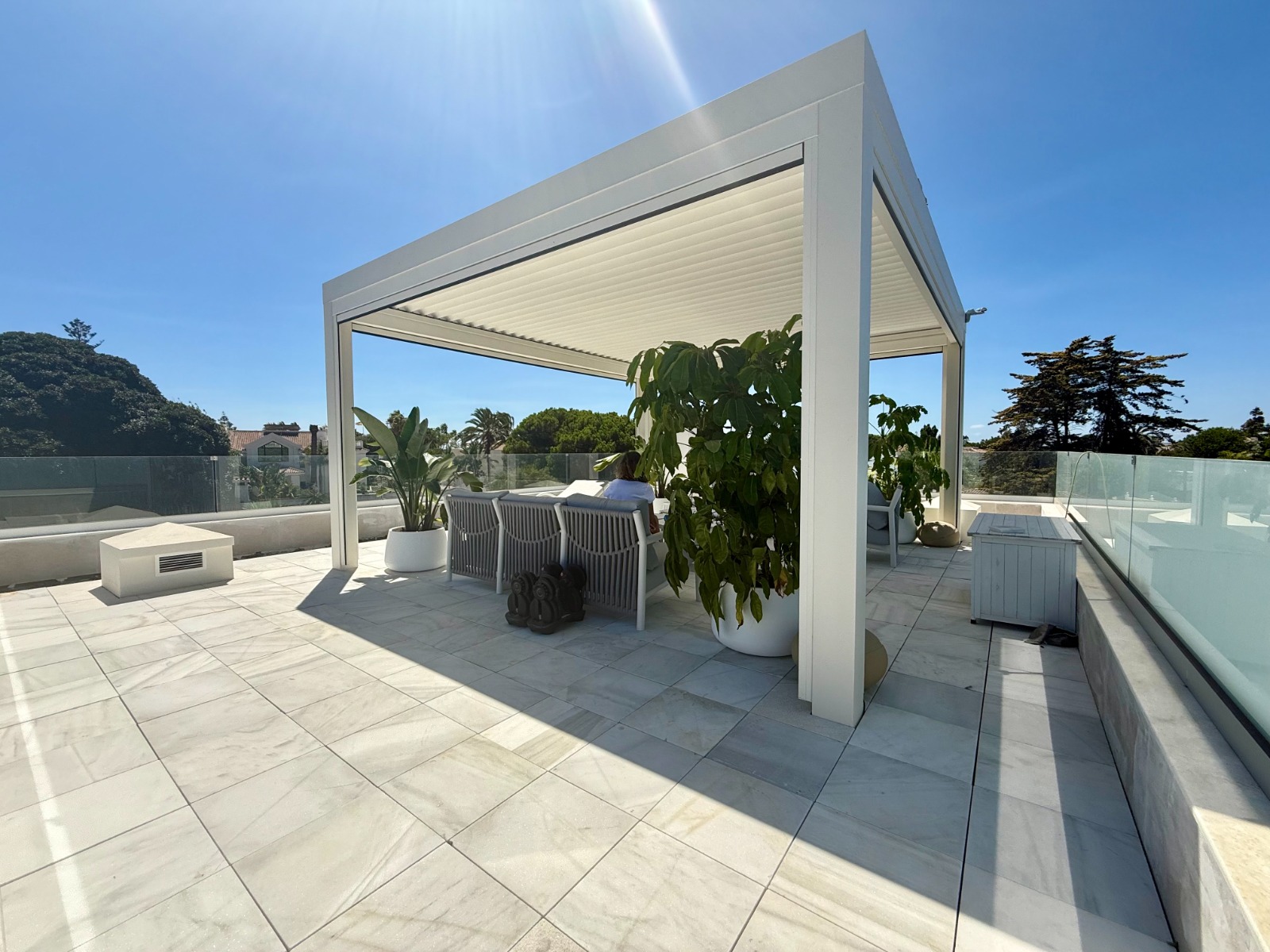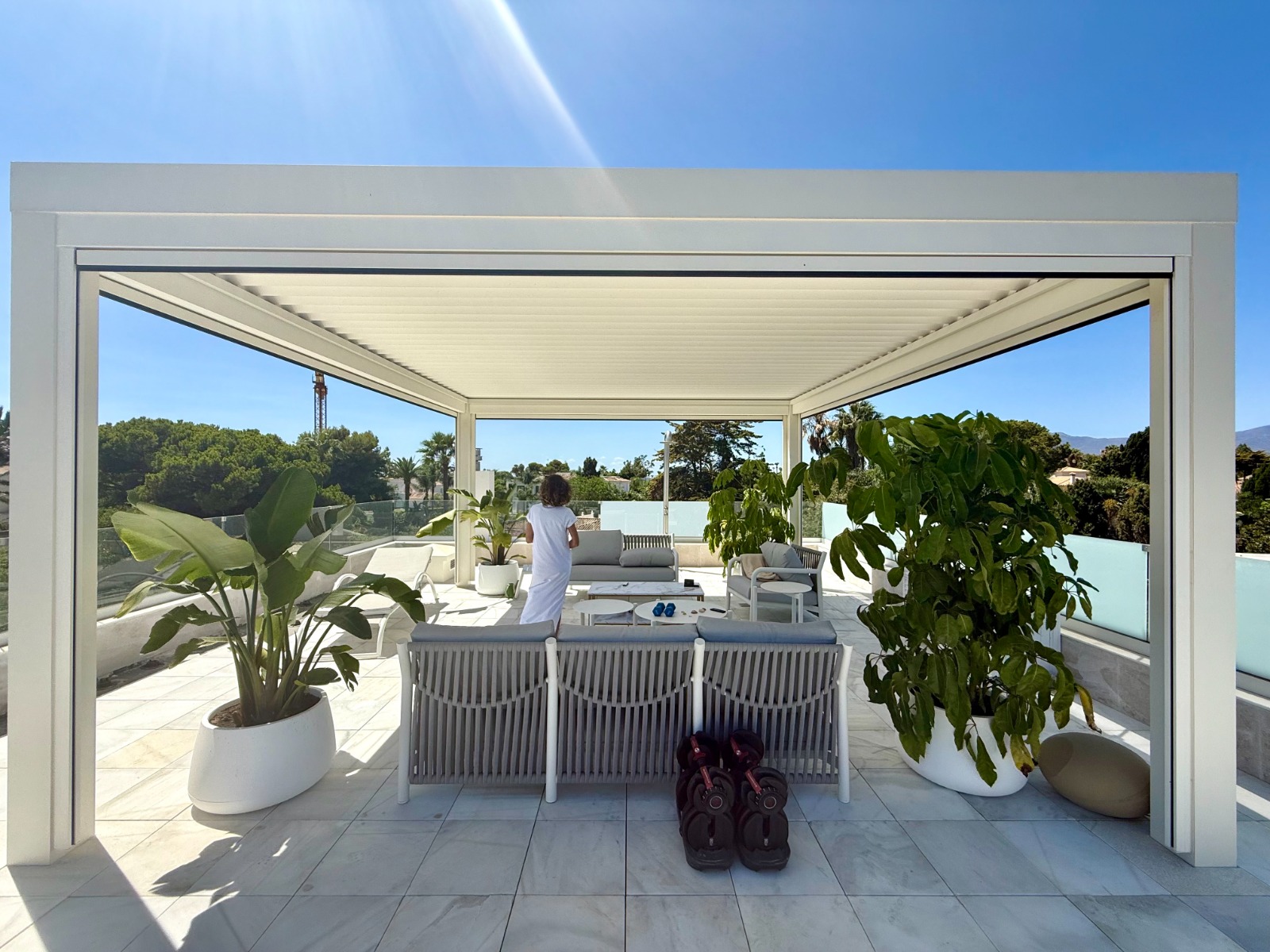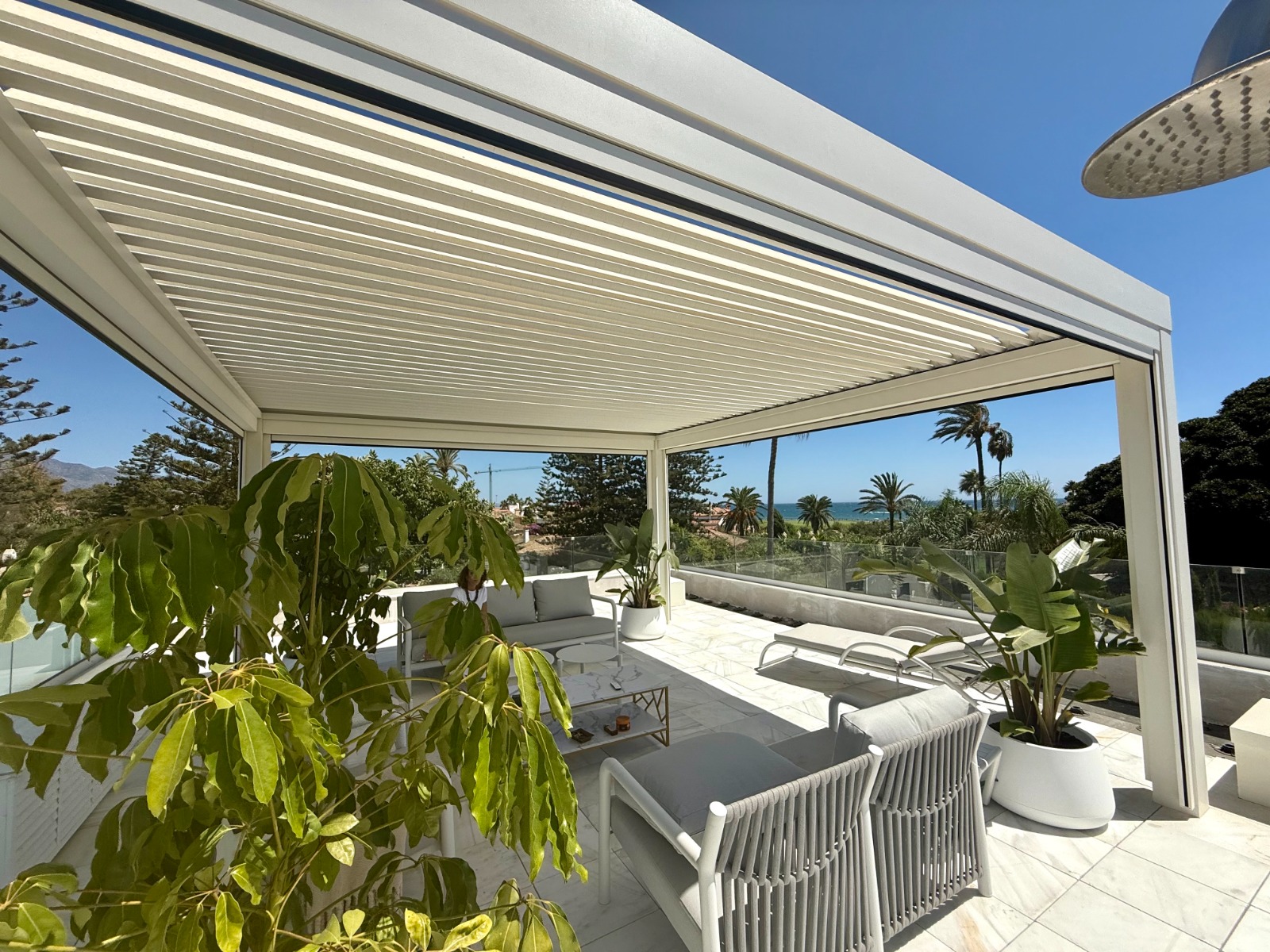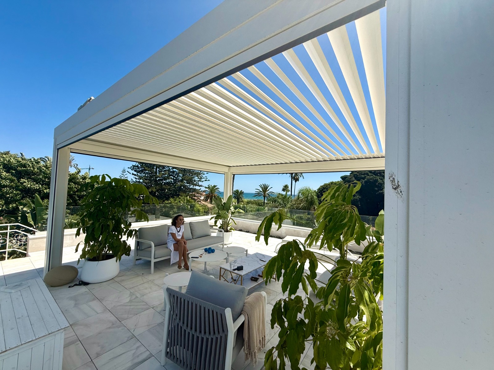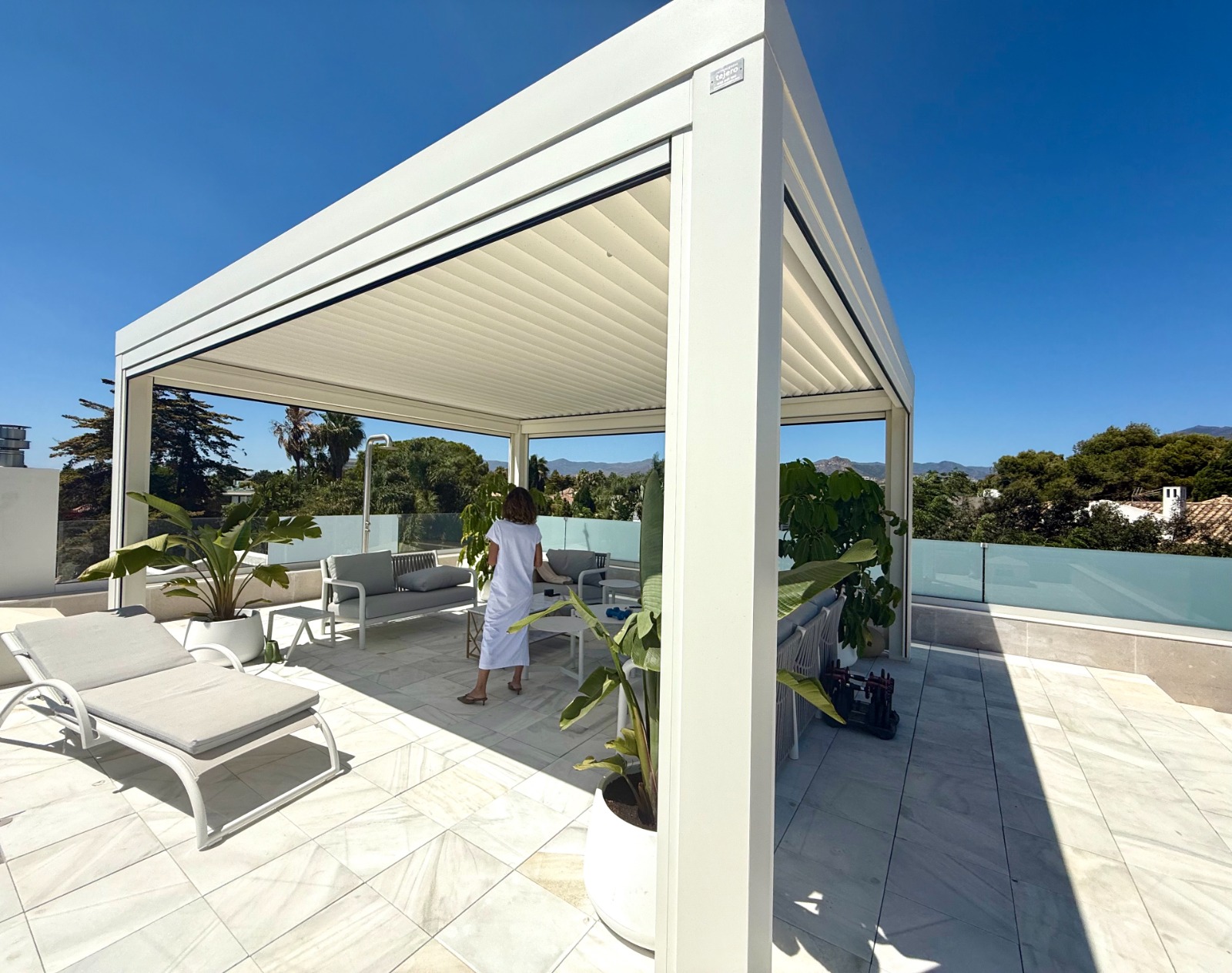Os traemos este proyecto realizado en Guadalmina Baja, entre Marbella y Estepona. Un proyecto un poco diferente ¿Por qué?. Porque en esta ocasión hemos realizado la instalación de la pérgola bioclimática en la terraza, pero en forma de isla, con las 4 caras visibles.