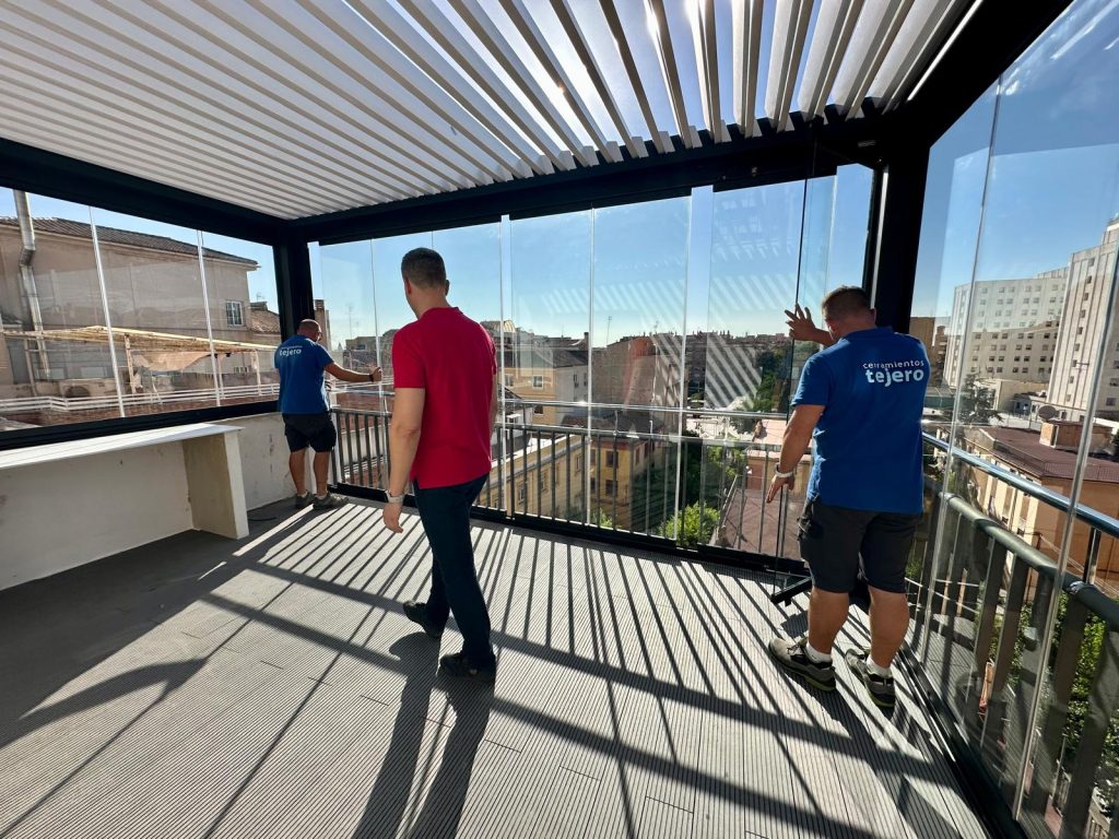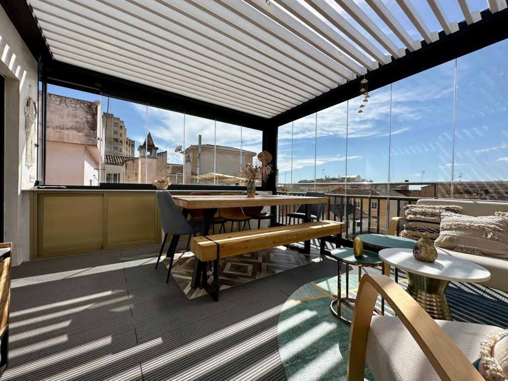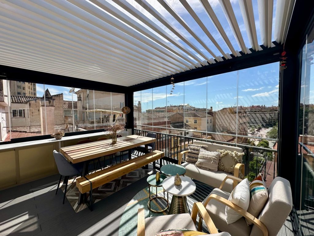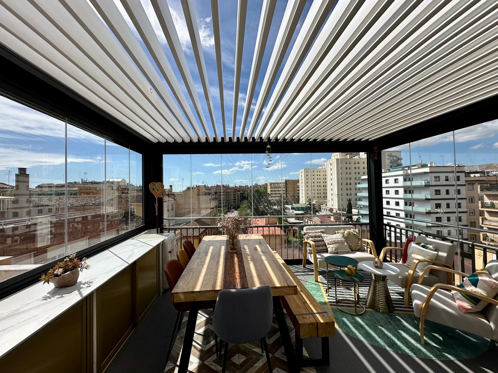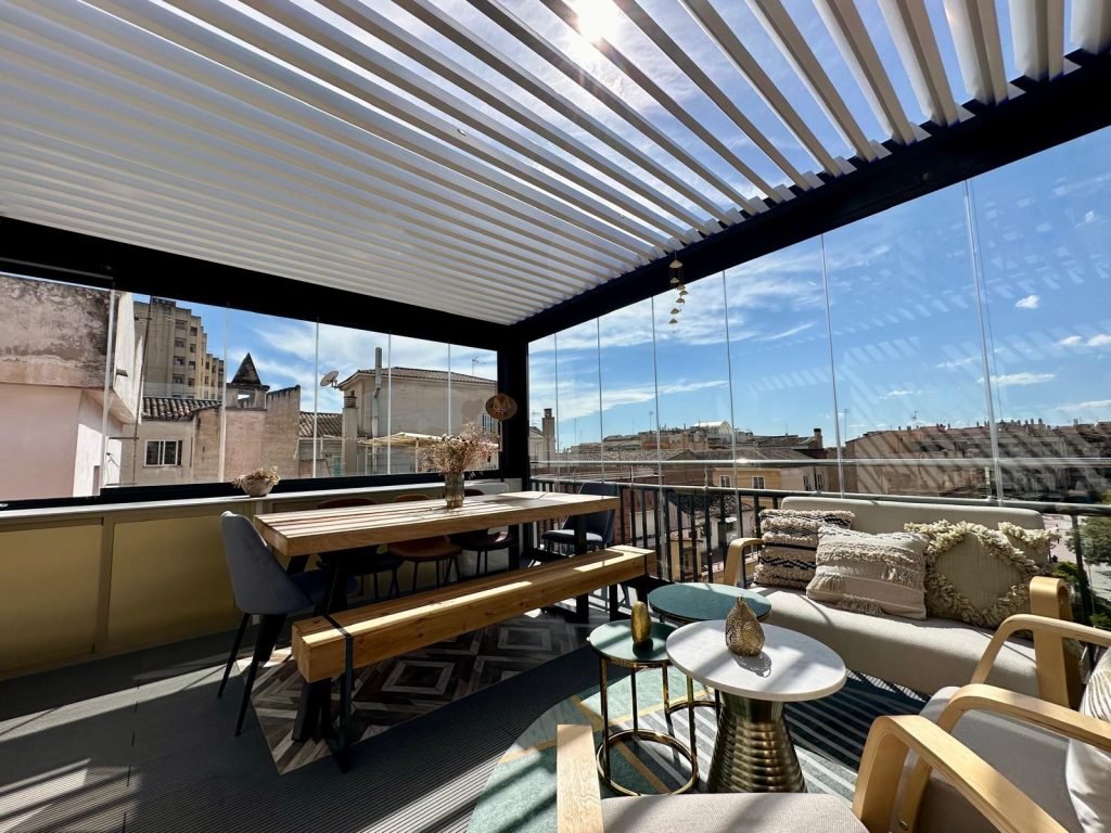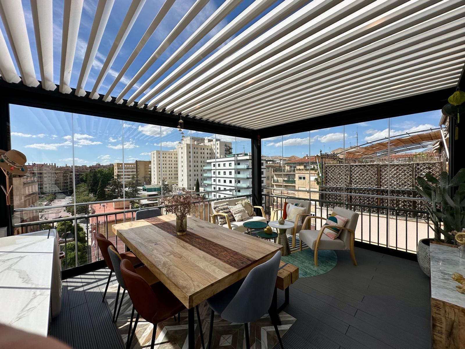 En esta ocasión presentamos esta instalación realizada en Granada en la zona Plaza De Toros, compuesta de pérgola bioclimática de lamas orientables con descuadre, iluminación LED RGB perimetral + sistemas verticales de cortinas de cristal abatibles + tarima técnica de PVC, también incorporamos el sensor de lluvia.