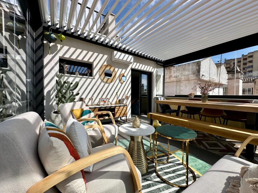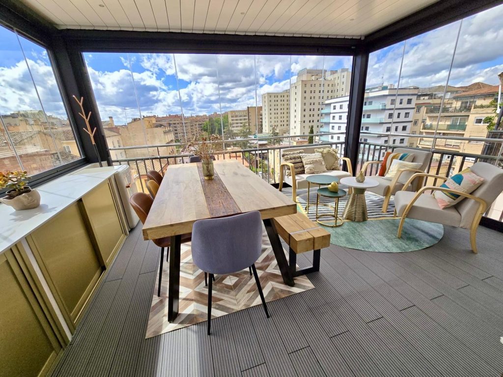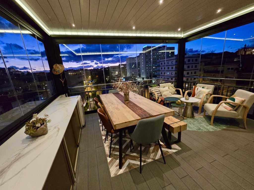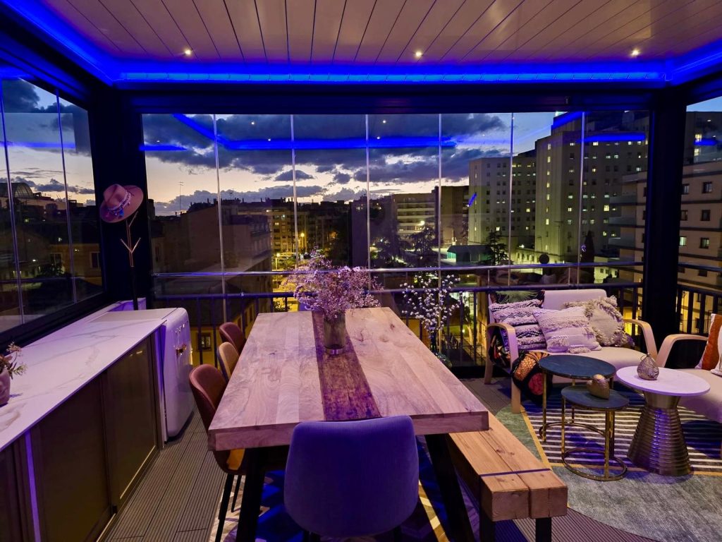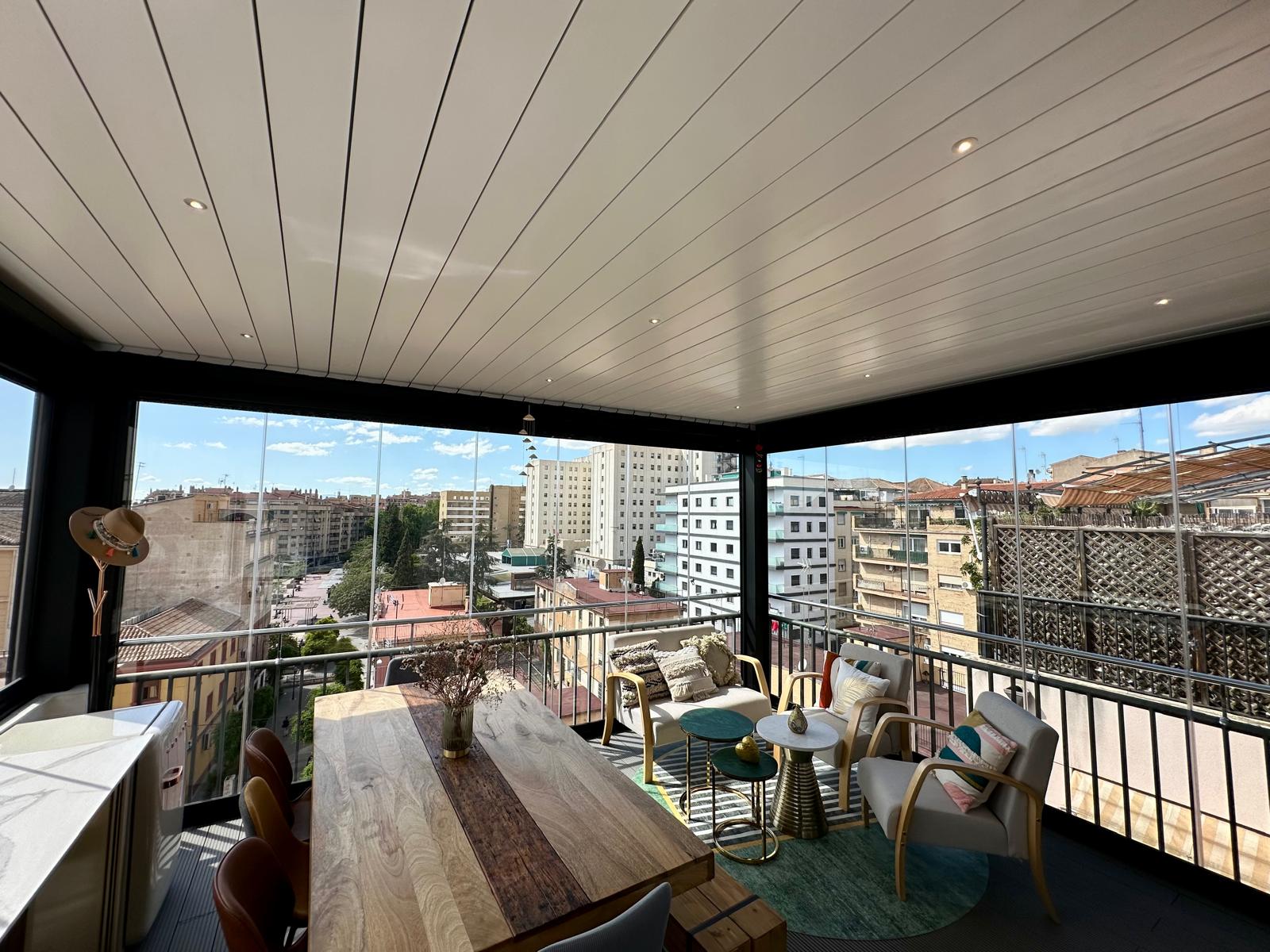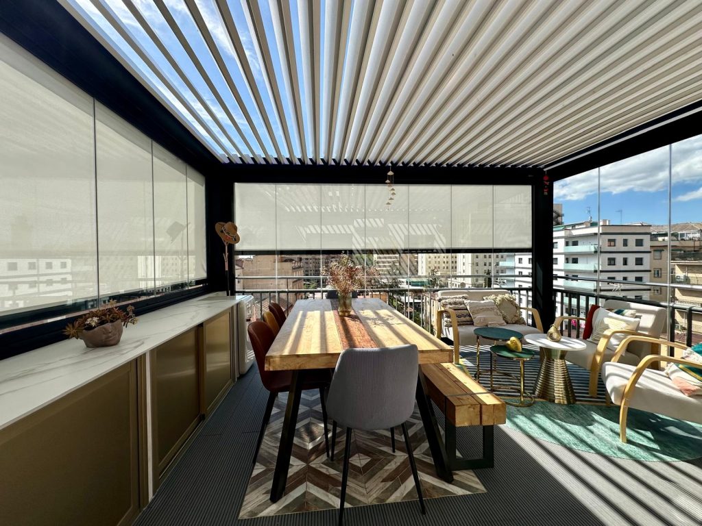 En esta ocasión presentamos esta instalación realizada en Granada en la zona Plaza De Toros, compuesta de pérgola bioclimática de lamas orientables con descuadre, iluminación LED RGB perimetral + sistemas verticales de cortinas de cristal abatibles + tarima técnica de PVC, también incorporamos el sensor de lluvia.